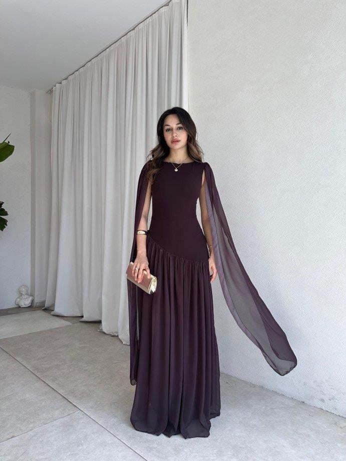 Maxi Boy Şifon Kumaş Pelerinli Etek Kısmı Pilili Abiye Elbise - ACI KAHVERENGİ (b13979_S)